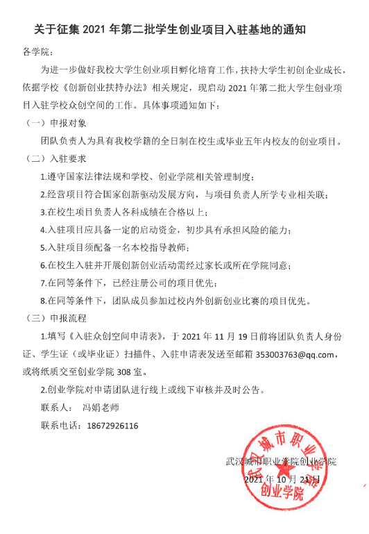 关于征集2021年第二批学生创业项目入驻基地的通知